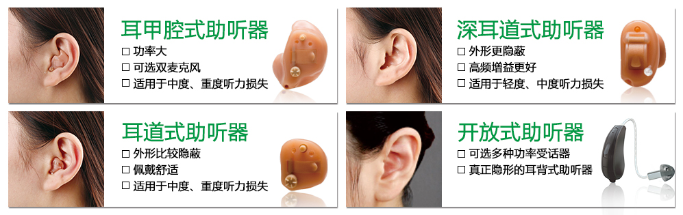 耳內式、耳道式、深耳道式及隱形深耳道式助聽器,需要按照患者的耳朵形狀定做,符合患者"將助聽器隱蔽起來"的心理,助聽器分別位于耳廓內、耳道內及耳道深部,體積依次減小,但功率也隨體積逐漸減小,只適合輕度到中重度聽力損失。