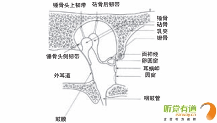 <span style="font-size:16px;"> 中耳結構包括鼓室、咽鼓管、鼓竇和乳突腔四部分。鼓室內有聽骨、肌肉、韌帶和神經。中耳是換能器,換能是將一種能量形式轉換成另一種能量形式,中耳通過鼓膜和聽骨鏈將聲能轉換為機械能,再由鐙骨底板將機械能轉換為內耳的液態能。</span></p><p><span style="font-size:16px;"> 鼓膜是中耳和外耳的分界,呈橢圓形,中間稍向內凹陷,色灰白,較透明,與耳道底約呈30°角。鼓膜寬約8mm,高約9mm,厚0.1mm,質地韌,其構造分三層:外層是皮膚層,中層由淺層的放射狀和深層的環狀纖維組成,它們使得鼓膜能承受一定的氣壓和水壓并抗感染,內層為粘膜層,與鼓室粘膜相連續。聲音的振動,即聲能,通過耳郭和耳道共振的加強,引起鼓膜隨之振動,鼓膜與中耳的錘骨相連,在正常耳,錘骨懸掛在自鼓膜頂端至下2/3處。錘骨柄的尖端將鼓膜頂向中耳,形成錐形鼓膜的頂,稱作臍。自臍向前下達鼓膜邊緣有一個三角形的反光區,名光錐,是外來光線被鼓膜的凹面集中反射而成。鼓膜下4/5為緊張部,上1/5由于缺乏纖維層而較松馳,稱為松弛部。鼓膜可分為前上、前下、后上、后下四個象限。兒童的鼓膜薄而有彈性,年齡越大,鼓膜越厚且越僵硬。鼓環將鼓膜固定在某一位置,使其成為在外耳和中耳之間的一層防水防氣的屏障。</span></p><center><span style="font-size:16px;"><img alt="" src="/upfiles/201810080137189845.png" width="440" height="250" /></span></center><p></p><p><span style="font-size:16px;"> 中耳鼓室</span></p><center><span style="font-size:16px;"><img alt="" src="/upfiles/201810080137242362.png" width="440" height="250" /></span></center><p></p><p><span style="font-size:16px;"> 正常鼓膜像(左)</span></p><p><span style="font-size:16px;"> 在中耳腔內的聽骨是人體最小的骨頭,分別叫作錘骨、砧骨和鐙骨。這些聽骨由韌帶連接并懸掛起來形成了聽骨鏈。錘骨柄附在鼓膜上,錘骨頭與砧骨頭形成錘砧關節,砧骨底與鐙骨頭形成砧鐙關節,鐙骨底板由環狀韌帶固定在卵圓窗上。聽骨鏈利用杠桿原理使來自鼓膜的機械能放大,傳遞到卵圓窗。</span></p><center><span style="font-size:16px;"><img alt="" src="/upfiles/201810080137303051.png" width="440" height="250" /></span></center><p></p><p><span style="font-size:16px;"> 聽骨鏈</span></p><p><span style="font-size:16px;"> 咽鼓管是中耳通氣引流的唯一途徑,也是中耳感染的主要途徑。它的一端開口在較高的中耳鼓室腔,另一端開口在較低的鼻咽部,通過咽鼓管在鼻咽部的開口,空氣可從外界直接進入中耳腔。咽鼓管平時處于關閉狀態,能較好的防止細菌感染,只有在咳嗽、擤鼻涕、打哈欠或吞咽時,咽鼓管才開放。當咽鼓管開放時,根據鼓膜外側的壓力情況,空氣或者從中耳流向外界,或者從外界流向中耳,使中耳壓力得以平衡。</span></p><p><span style="font-size:16px;"> 更多詳情請登錄m.4fbb.cn</span></p>" />