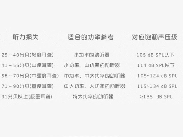 國際上把根據助聽器的飽和聲壓級分為五類:小功率(105dB SPL以下),中功率(105~114dB SPL),中大功率(125~134dB SPL),大功率(125~134dB SPL),特大功率(135dB SPL以上)。