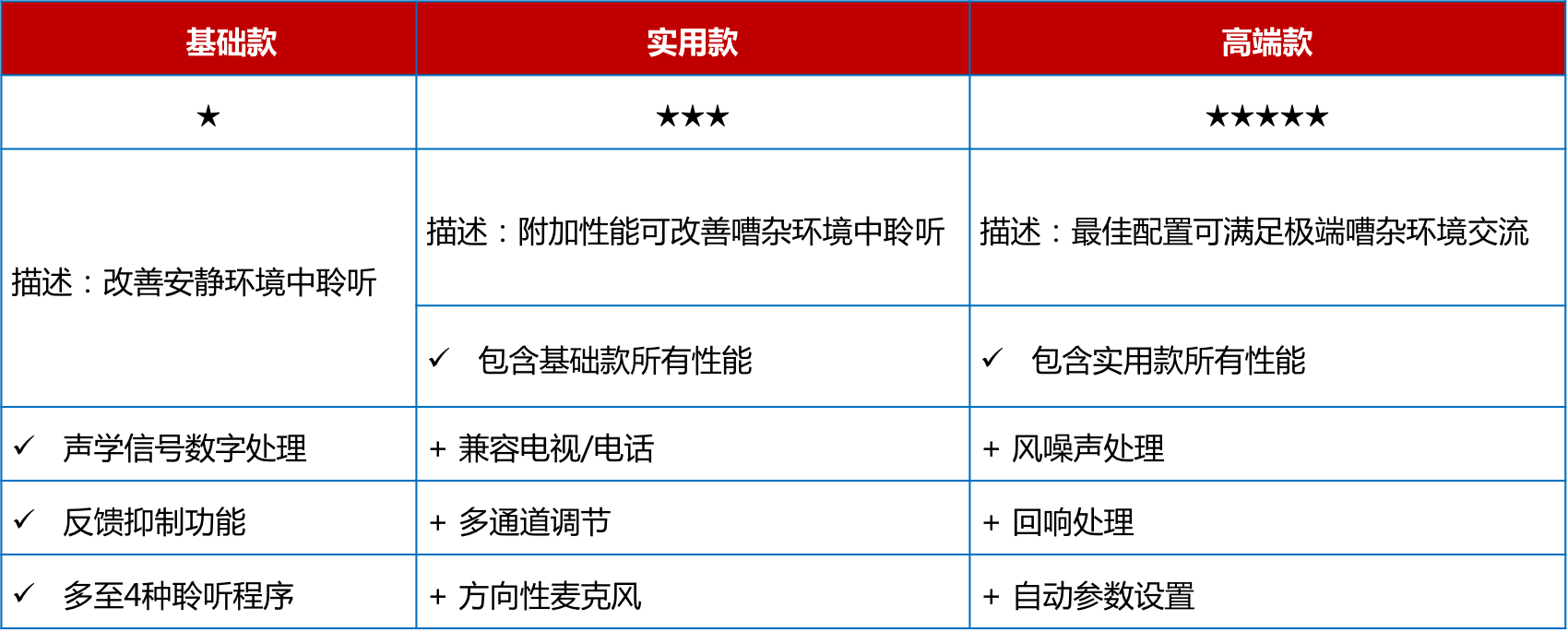 <span style="font-size:16px;"> 助聽器價格取決于機器的檔次,而檔次由內含的技術種類決定。助聽器檔次大致可分為基礎款、實用款、高端款。這三種檔次的區別請參見下表:</span></p><p style="text-align: center;"><span style="font-size:16px;"><img src="/upfiles/201808150226553383.png" width="640" alt="" /><br /></span></p><p><span style="font-size:16px;"> 那么,如何應該選擇哪種檔次的助聽器呢?</span></p><p><span style="font-size:16px;"> 選擇助聽器時主要需要考慮兩大因素。首先要考慮的就是弱聽人士的聽力損失程度,其次要考慮的就是弱聽人士的日常生活方式。比方說,某位弱聽人士是中度聽力損失,日常在家為主,那么實用款檔次助聽器通常可以滿足TA的需求。</span></p><p><span style="font-size:16px;"> 當然,這里只是為助聽器選配提供了大致方向,如何選配仍然需要具體情況具體分析,最好還是需要跟驗配師面對面溝通。</span></p><p><span style="font-size:16px;"> 1、高端款助聽器</span></p><p><span style="font-size:16px;"> 不同廠家的高端款助聽器均代表了各自的尖端技術,并致力于提供最佳的音質。</span></p><p><span style="font-size:16px;"> 這類助聽器高端之處在于自動適應各種聆聽環境,最優化佩戴者的聆聽清晰度和舒適度,讓佩戴者在極度嘈雜的環境中,如咖啡館,也能清晰地聽到同伴的言語聲。常見性能包括:</span></p><p><span style="font-size:16px;"> (1) 多種外觀、顏色可選;</span></p><p><span style="font-size:16px;"> (2) 環境自適應;</span></p><p><span style="font-size:16px;"> (3) 360°信號追蹤;</span></p><p><span style="font-size:16px;"> (4) 兼容各種藍牙設備。</span></p><p><span style="font-size:16px;"> 高端款助聽器為什么能夠自動適應各種聆聽環境呢?這是因為左右兩側的高端款助聽器能夠相互“通電報”,精準判斷所處的聆聽環境并自主學習,給出最佳的助聽設置。</span></p><p><span style="font-size:16px;"> 比如,您經常出入一家書店,每次您進入這家書店時總是習慣性地將音量調低2分貝;長此以往,當您再次進入該書店時,兩臺助聽器將會默契地降低2分貝。</span></p><p><span style="font-size:16px;"> 360°信號追蹤可以幫助佩戴者建立更佳的空間感知,對所處環境有充足的把控和預判,避免一些潛在的危險。而當助聽器連接至各種藍牙設備時,聆聽清晰度會更高,且不會打擾其他人。</span></p><p><span style="font-size:16px;"> 比如家人總是抱怨您把電視機聲音開得太大,拒絕跟您一起觀看電視時,您可以選配能夠兼容電視的助聽器,并進行獨立的音量調節,而家人只需設置為常規音量即可。高端款助聽器的價位一般在15000以上。</span></p><p style="text-align: center;"><span style="font-size:16px;"><img src="/upfiles/201808150228328500.jpg" alt="" /><br /></span></p><p><span style="font-size:16px;"> 2、實用款助聽器</span></p><p><span style="font-size:16px;"> 實用款助聽器的價格一般在8000~15000之間。實用款助聽器包含一定的降噪技術和言語提升功能,可以滿足大多數環境中的聆聽需求。部分廠家的實用款助聽器也可兼容各種藍牙設備。實用款助聽器的突出性能大致包括:</span></p><p><span style="font-size:16px;"> (1) 可連接外接音源;</span></p><p><span style="font-size:16px;"> (2) 言語清晰度提升;</span></p><p><span style="font-size:16px;"> (3) 方向性功能。</span></p><p><span style="font-size:16px;"> 3、基礎款助聽器</span></p><p><span style="font-size:16px;"> 基礎款助聽器的價位一般在8000以下。基礎款助聽器能夠滿足安靜環境中的交流需求,并具備反饋管理功能。反饋管理功能能夠有效提升佩戴舒適度,避免在日常佩戴過程中出現尖銳的干擾聲。</span></p><p><span style="font-size:16px;"> 基礎款助聽器適用于經常在家的弱聽人士,若是生活方式比較豐富多彩的弱聽人士建議選配其他檔次的助聽器。實用款助聽器的突出性能大致包括:</span></p><p><span style="font-size:16px;"> (1) 數字信號處理技術;</span></p><p><span style="font-size:16px;"> (2) 反饋管理功能;</span></p><p><span style="font-size:16px;"> (3) 多種聆聽程序可選。</span></p><p><span style="font-size:16px;"> 更多詳情請登錄m.4fbb.cn。</span></p>" />