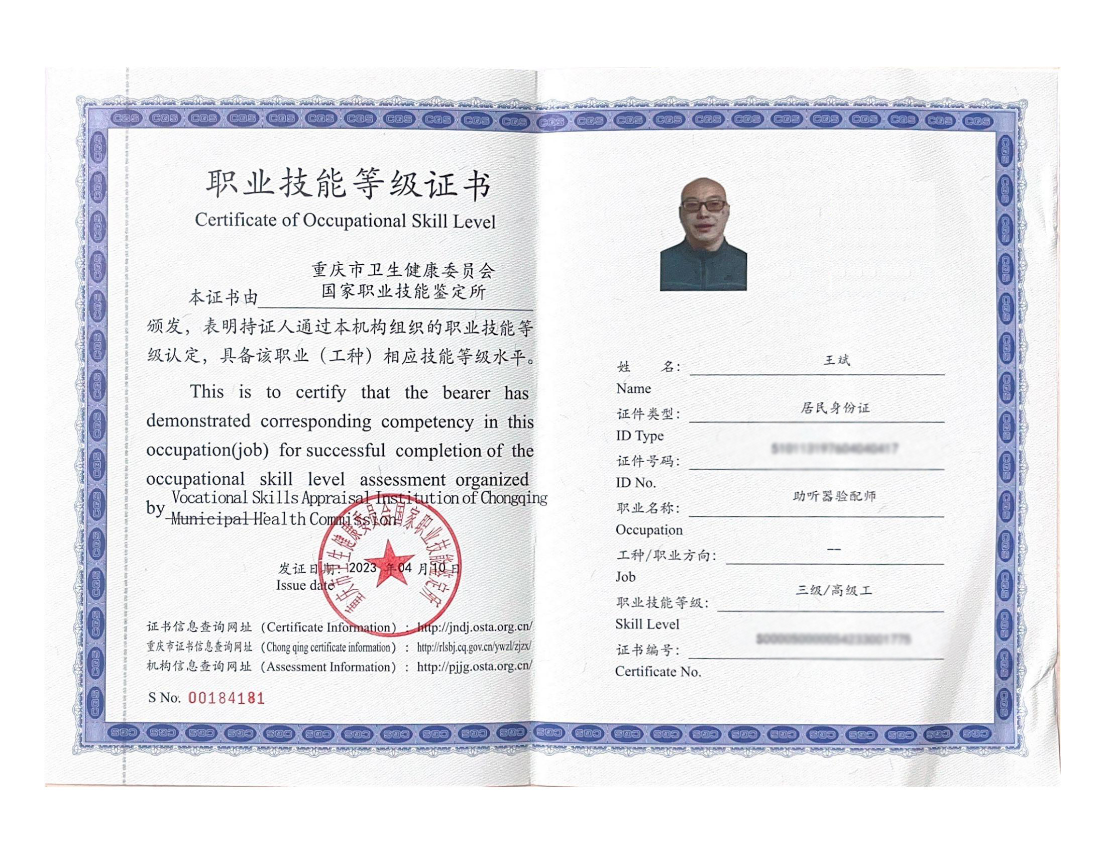 <span style="white-space:pre"> </span>熱烈祝賀聽覺有道全國聽力連鎖聽力專家王斌、王杰、蔣方琴和任會敏榮獲國家認(rèn)證三級助聽器驗(yàn)配師職業(yè)資格證書!<br /><br /> <strong>驗(yàn)配師職業(yè)資格證書</strong><br /><br /> 助聽器驗(yàn)配師是一個(gè)有技術(shù)深度的職業(yè),對聽力知識儲備和實(shí)踐操作熟練度都有一定要求。<br /><br /> 這張由國家機(jī)構(gòu)認(rèn)證頒發(fā)的驗(yàn)配師職業(yè)資格證書,正是最具權(quán)威性和直觀公平的評判標(biāo)準(zhǔn)。<br /><br /></span><p><span style="font-size:16px;"> 本次三級助聽器驗(yàn)配師職業(yè)技能等級認(rèn)定,聽覺有道參與人數(shù)4人,通過認(rèn)定4人,通過率為100%!</span></p><p><span style="font-size:16px;"><br /></span></p><p style="text-align: center;"><img src="/upfiles/20230511114521111.gif" width="640" alt="" /><br /></p><p style="text-align: center;"><br /></p><span style="font-size:16px;"><strong> 千里之行,始于足下</strong><br /><br /> 參與等級認(rèn)定的人員中,有認(rèn)真嚴(yán)謹(jǐn)?shù)膮^(qū)域運(yùn)營經(jīng)理,深受歡迎的區(qū)域技術(shù)培訓(xùn)主管,顏值實(shí)力并存的區(qū)域負(fù)責(zé)人以及非常資深的兒童聽力專家。<br /><br /> 他們都有共同的身份:一名優(yōu)秀的助聽器驗(yàn)配師。<br /><br /> 事實(shí)上,他們的實(shí)力早已達(dá)到三級助聽器驗(yàn)配師的標(biāo)準(zhǔn)。本次出征,信心滿滿,底氣十足,凱旋而歸!<br /></span><p style="text-align: center;"><img src="/upfiles/202305111145405493.jpg" width="640" alt="" /><br /></p><span style="font-size:16px;"> <strong>奮楫篤行,臻于至善</strong><br /><br /> 該職業(yè)技能等級證書由重慶市衛(wèi)生健康委員會國家職業(yè)技能鑒定所頒發(fā)。該鑒定所也是2020年底助聽器驗(yàn)配師考試改革后,全國備案成功的首家衛(wèi)健委系統(tǒng)鑒定機(jī)構(gòu),具有權(quán)威性。<br /><br /> 聽覺有道深耕聽力行業(yè)20多年,一直致力人才培養(yǎng),提升全體驗(yàn)配師的綜合業(yè)務(wù)能力,用專業(yè)、規(guī)范的技能解決聽損人士的問題,助其重新聆聽,感受世界的美好!<br /><br /></span><p><span style="font-size:16px;"> 期待全體驗(yàn)配師向優(yōu)秀榜樣學(xué)習(xí)!行而不輟,履踐致遠(yuǎn)!</span></p><p><span style="font-size:16px;"><br /></span></p><p style="text-align: center;"><img src="/upfiles/202305111145592511.jpg" width="640" alt="" /><br /></p>" />
